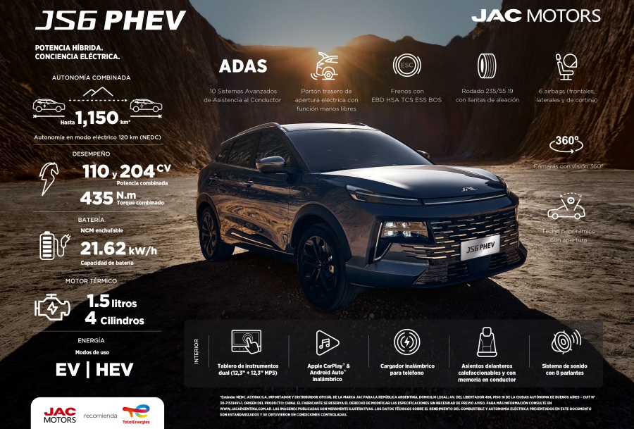 El JS6 PHEV es un SUV híbrido enchufable que combina un motor naftero 1.5 de 110 CV con uno eléctrico de 150 kW (204 CV), alcanzando una potencia conjunta de 310 CV. Su batería de 21,62 kWh, le otorga una autonomía de hasta 1.150 kilómetros, con un rango de 120 km en modo eléctrico.