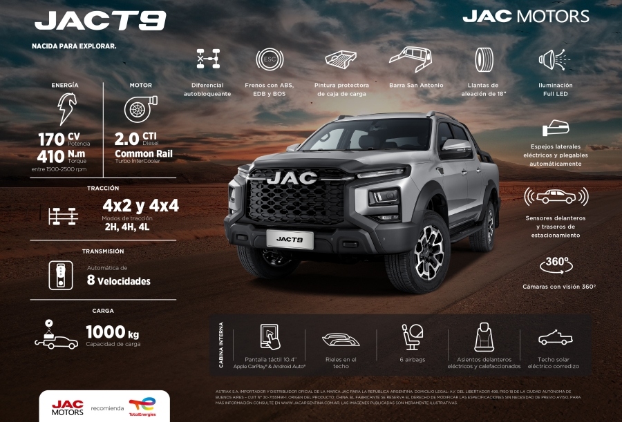 Finalmente, la JACT9 se posiciona como una camioneta mediana impulsada por un motor turbodiésel 2.0 CTI de 170 CV y 410 Nm, asociado a una caja automática de ocho velocidades y un sistema de tracción 4×4.