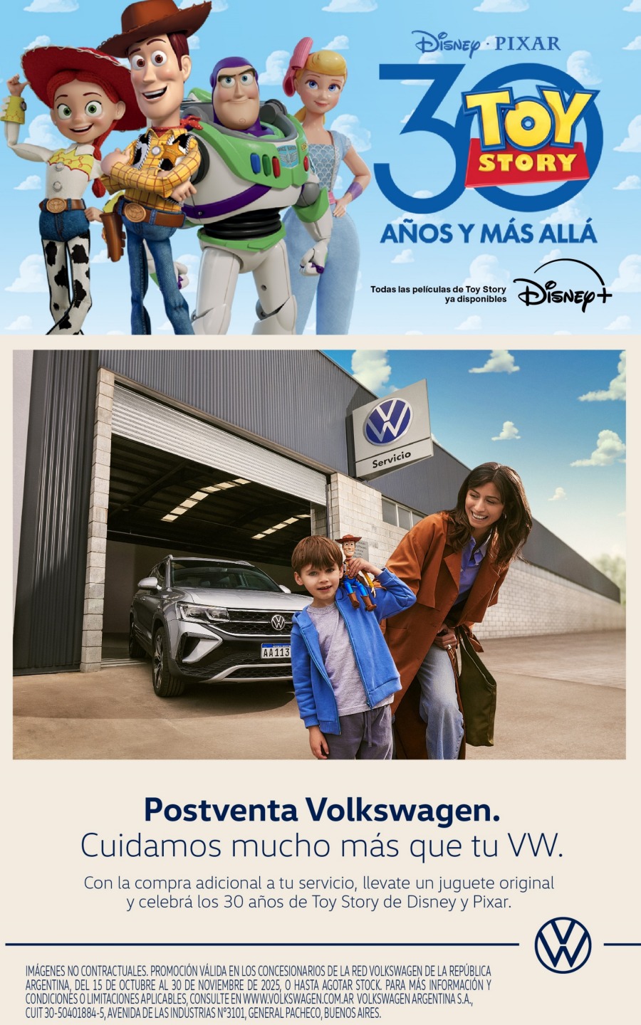 Volkswagen lanza una promoción especial en toda su red de talleres oficiales para conmemorar los 30 años de Toy Story. Desde el miércoles 15/10 hasta el domingo 30/11, quienes lleven su vehículo a realizar tareas de mantenimiento y realicen una compra adicional, recibirán como obsequio un muñeco original inspirado en los personajes de la película de Disney–Pixar.